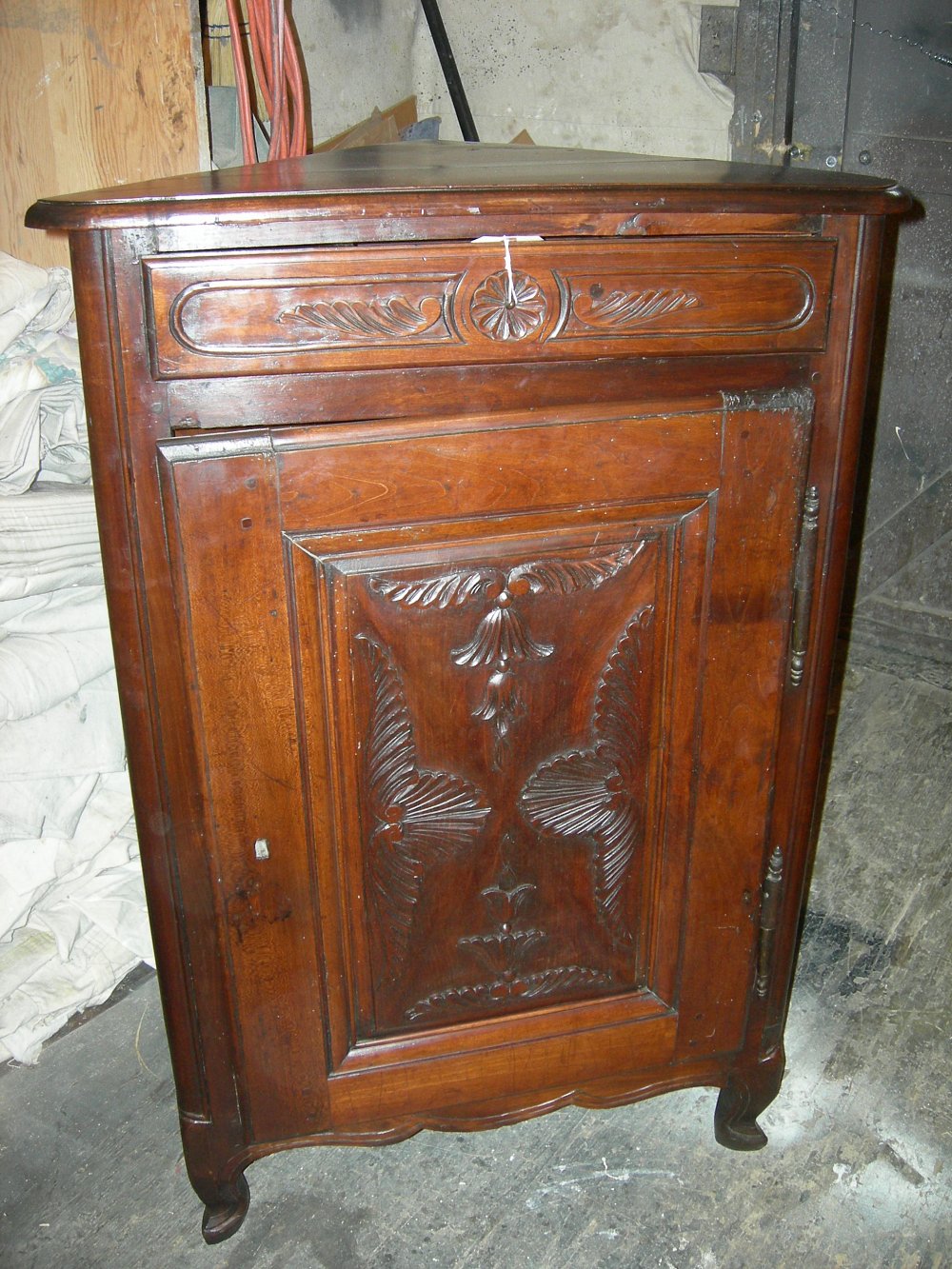 Corner Cabinet - Restored for ClientPrimitive Corner Cabinet. Circa 1820's. Walnut, beautiful carving. Cabinet door and top had split apart, needed to clam and glue to repair. Frost sides and top. Reproduced one leg that had broken too many times to repair. Matched finish on new pieces to look like 200 year old finish.