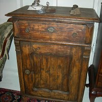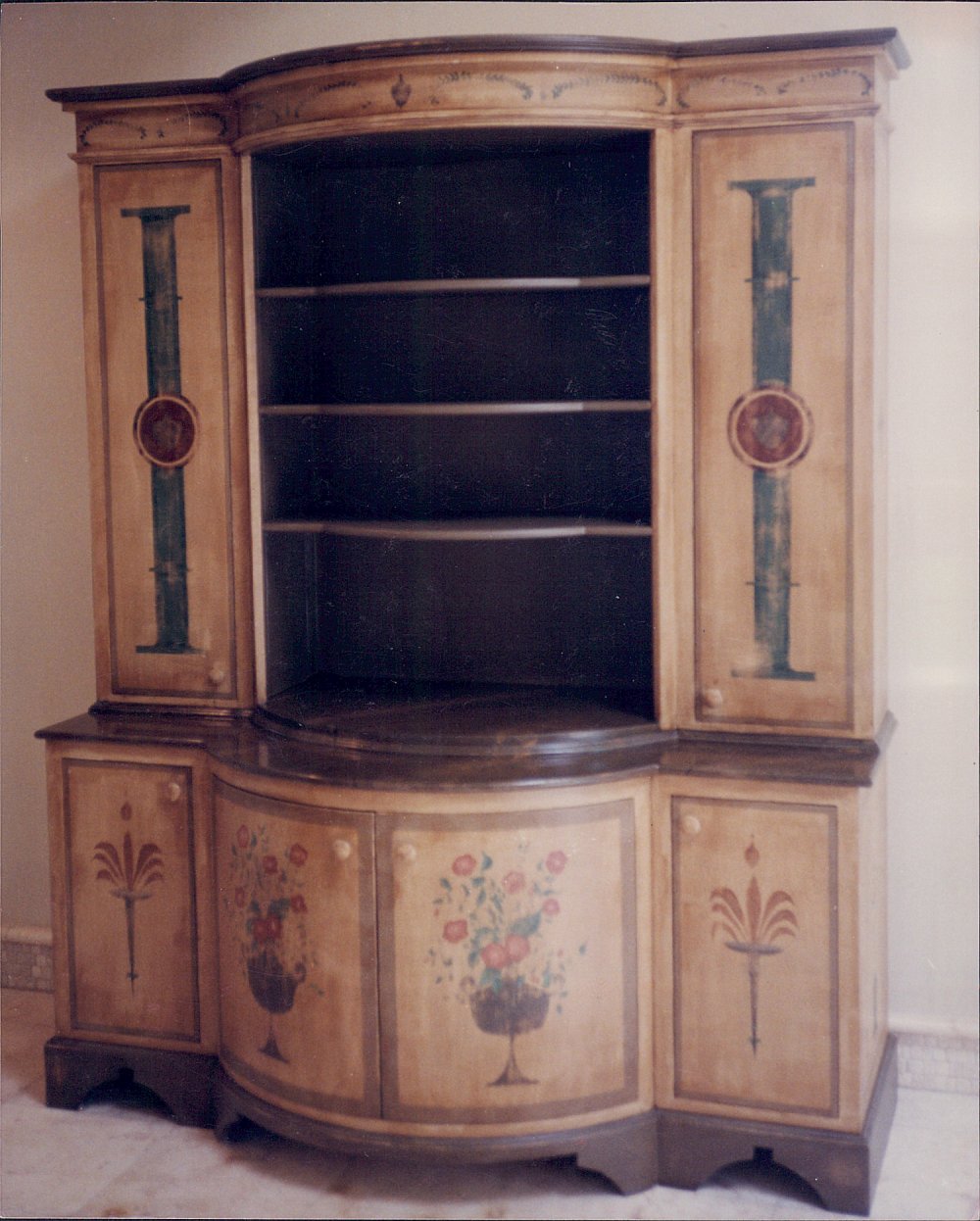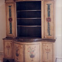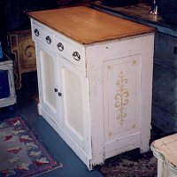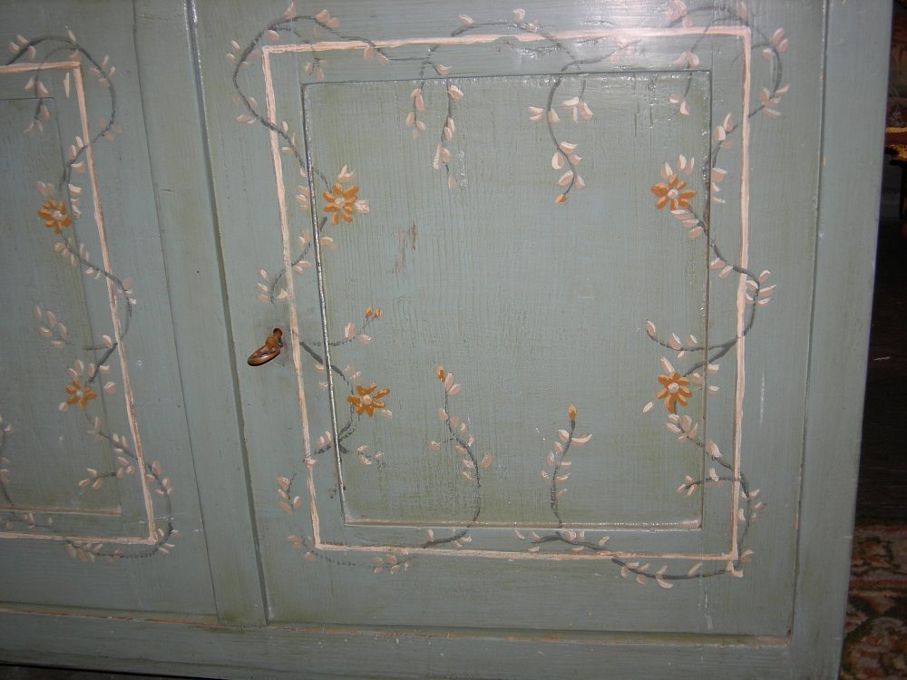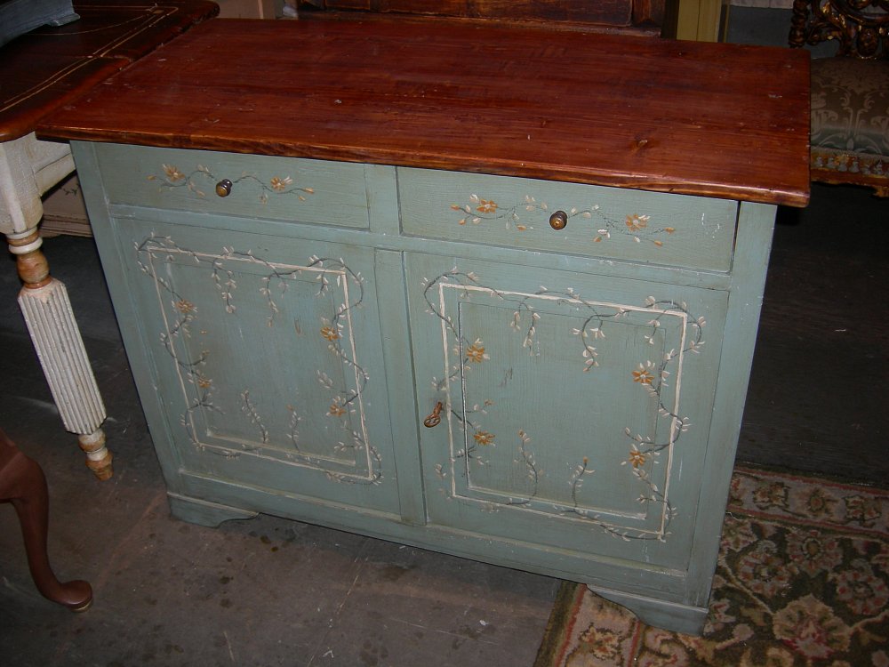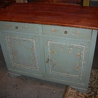 Hand-painted CabinetComplete restoration. Beautiful Cabinet circa 1800’s. Original hardware. Hand painted detail and finish giving this beautiful cabinet many uses in the home. Severely damaged, put back together piece by piece. Replaced wood where needed. Beautiful honey combed pine top.