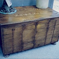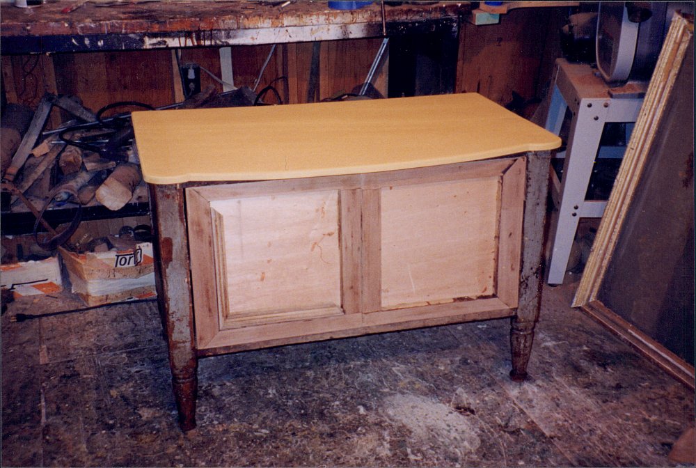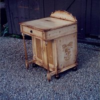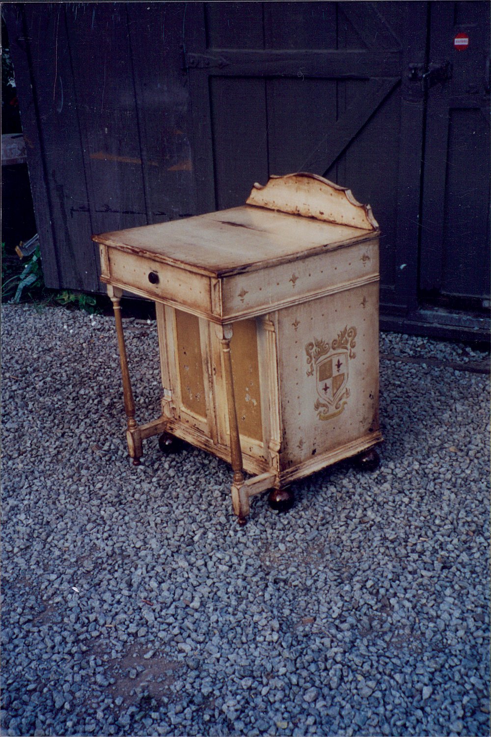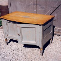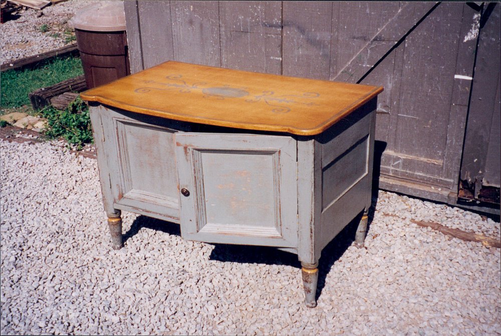 Small CabinetComplete restoration. Low Chest, decorative paint, detailed top. Piece damaged, made replacement top. Re-glued all joints in framing. Decorative design on top over copper covered base. Finish wax and buff.
