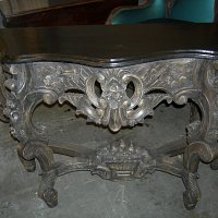 French Console - Restored for ClientFrench console, new construction. Applied muted umber finish. Hint of wood showing through. Wooden top transformed to faux black onyx. Waxed and butted.