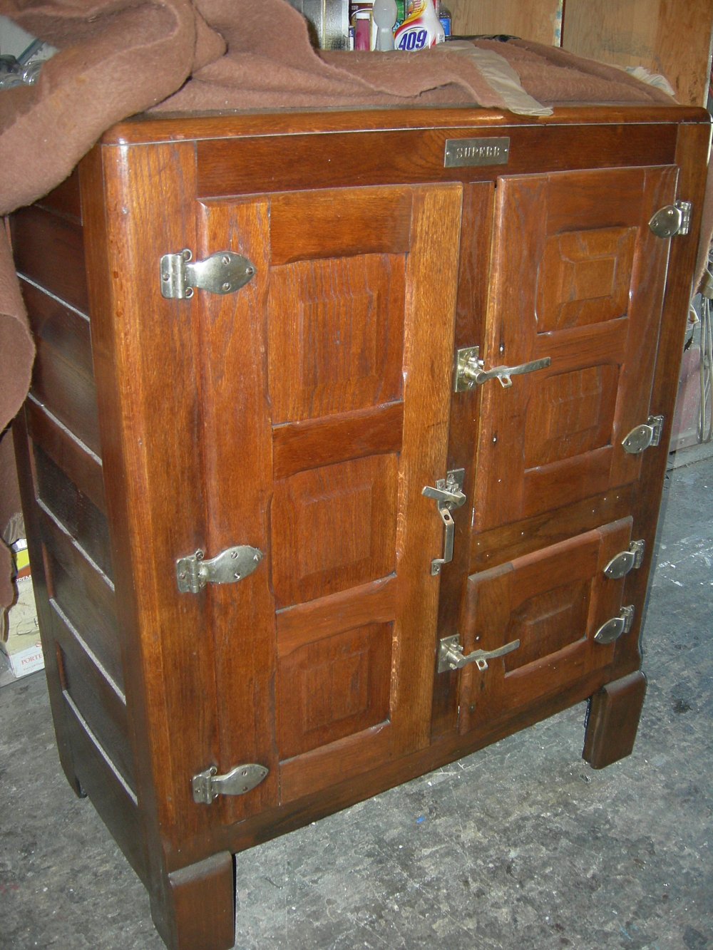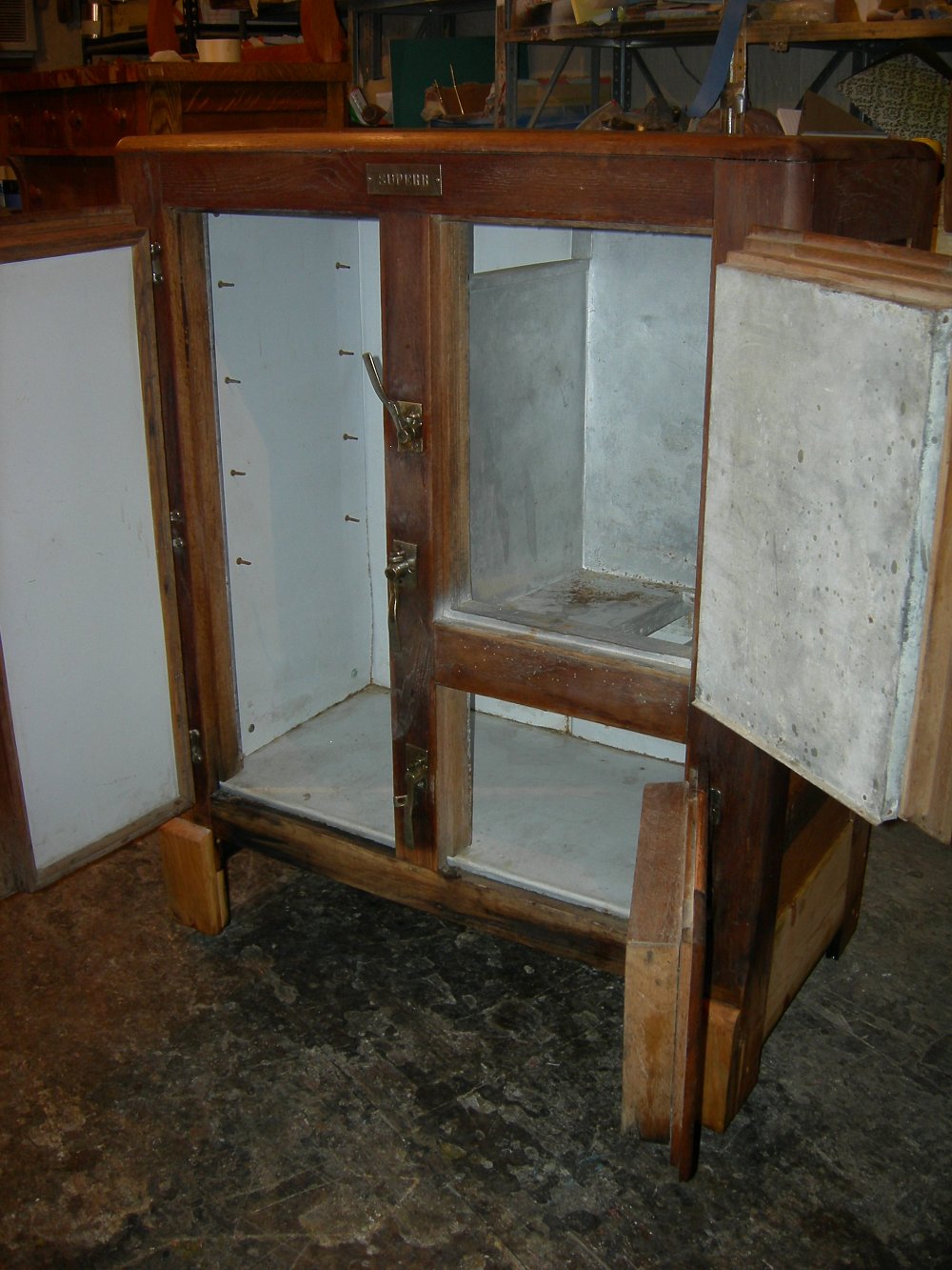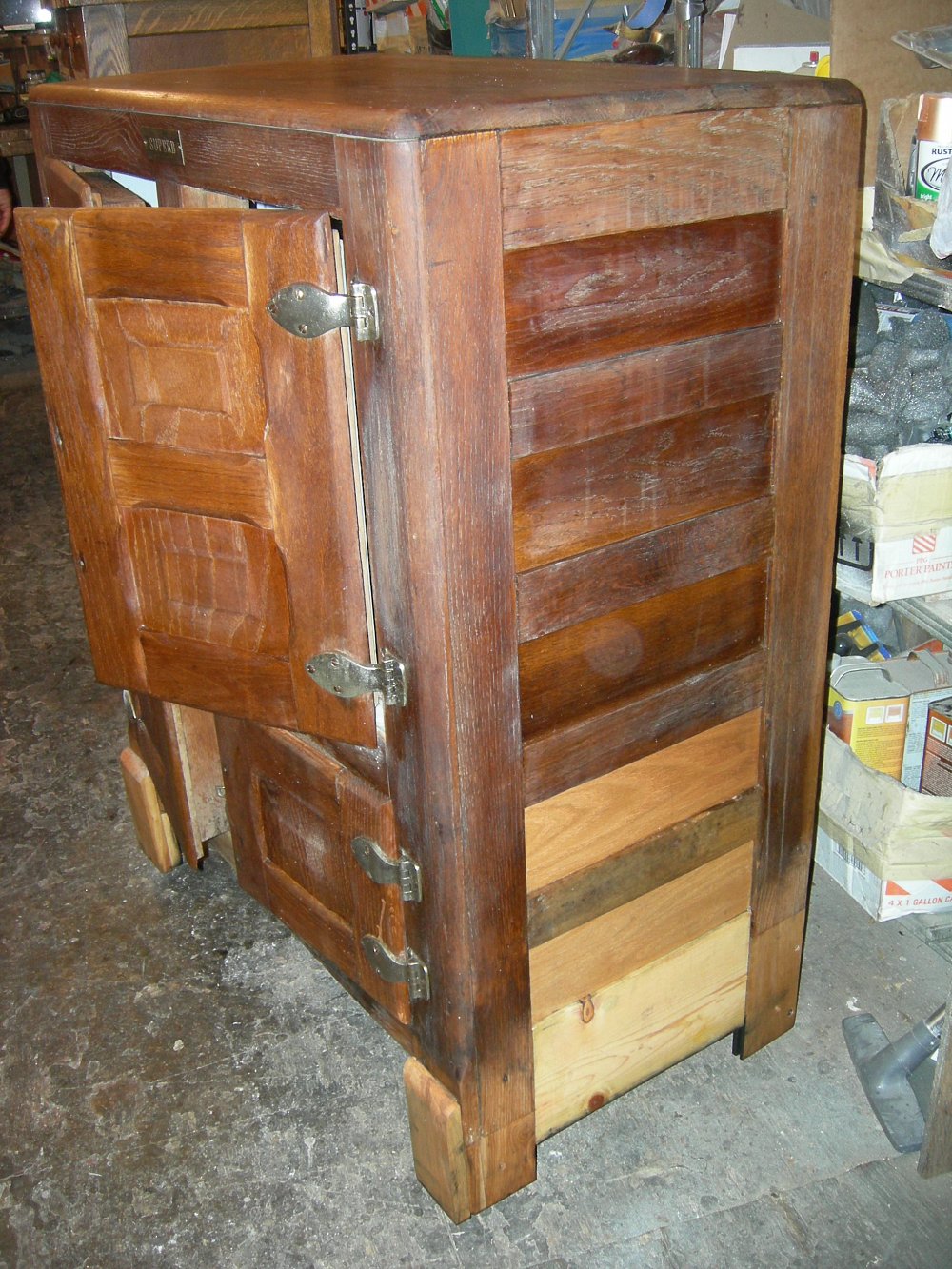 Oak Wooden Ice Box - Restored for ClientClient's grandfather's ice box (1905), bottom legs rotted so badly it would no longer stand. Took apart piece by piece, constructed legs and restored finish, and entire inside had to be cleaned. Beautiful period restoration, from the ground up. Aged finish.