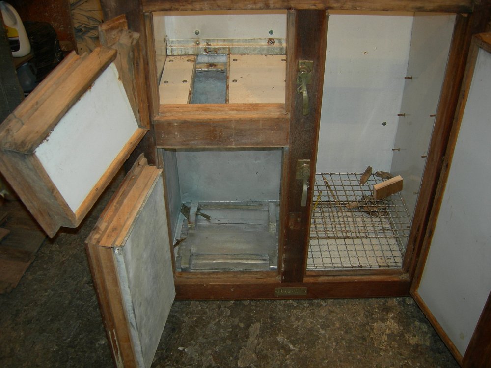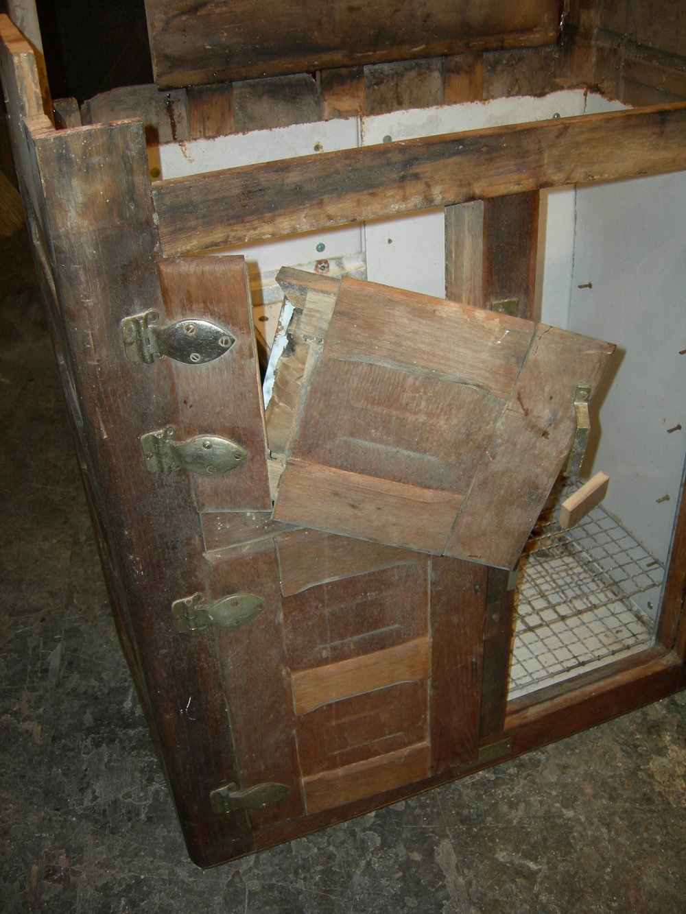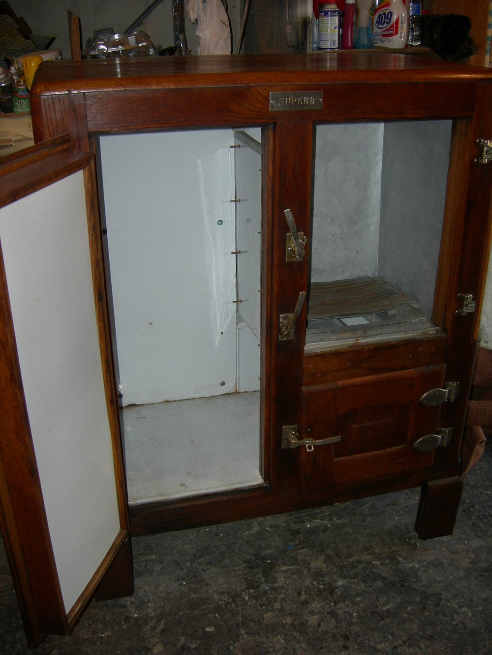 Oak Wooden Ice Box - Restored for ClientClient's grandfather's ice box (1905), bottom legs rotted so badly it would no longer stand. Took apart piece by piece, constructed legs and restored finish, and entire inside had to be cleaned. Beautiful period restoration, from the ground up. Aged finish.