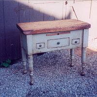 Kitchen Butcher BlockHandmade, one of a kind, Butchers Cutting Table, slab cutting surface, aged finish. Built from a drawing for a client. Top is 100 years old, 4" think piece of poplar wood. Legs are made from bedposts. Drawers are hand made. Great primitive piece.