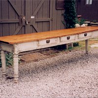 Harvest Table12'long Harvest Table with drawers purchased in Atlanta. Complete structural restoration. All joints in table re-glued and set. Additional bracing installed to make stable. Beautiful poplar 2 board top. Brilliant period finish.