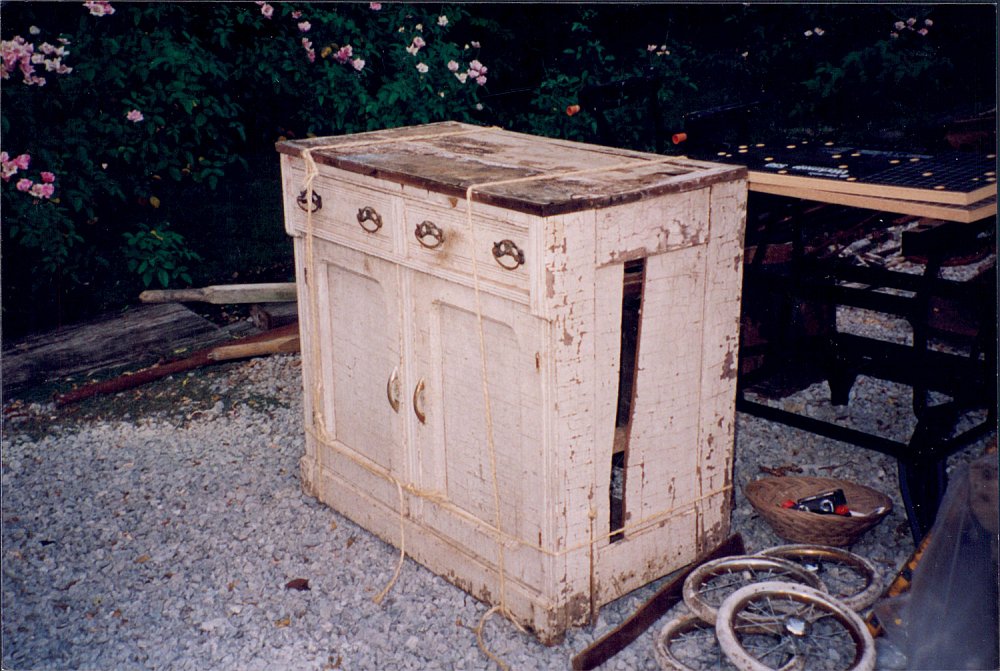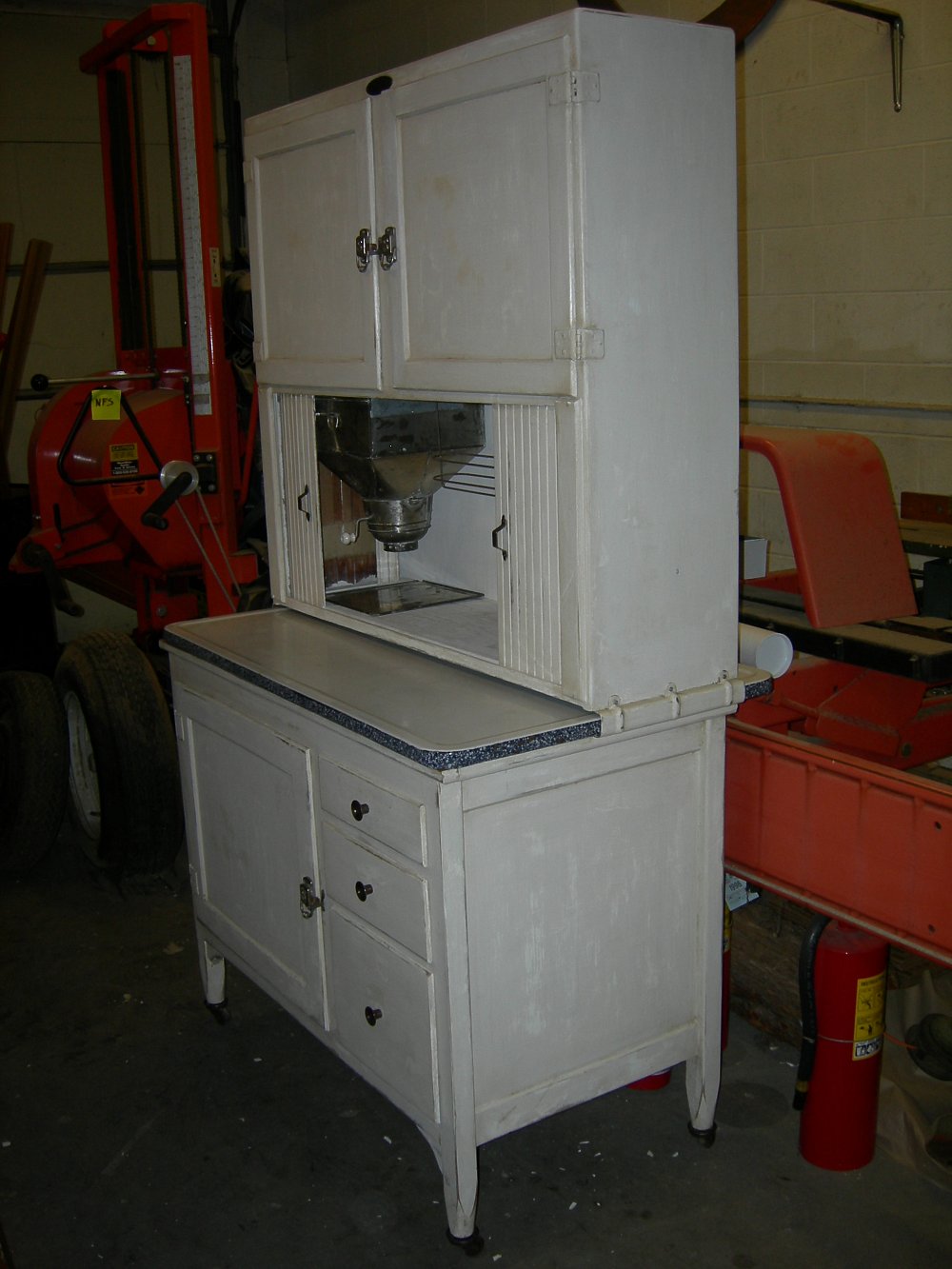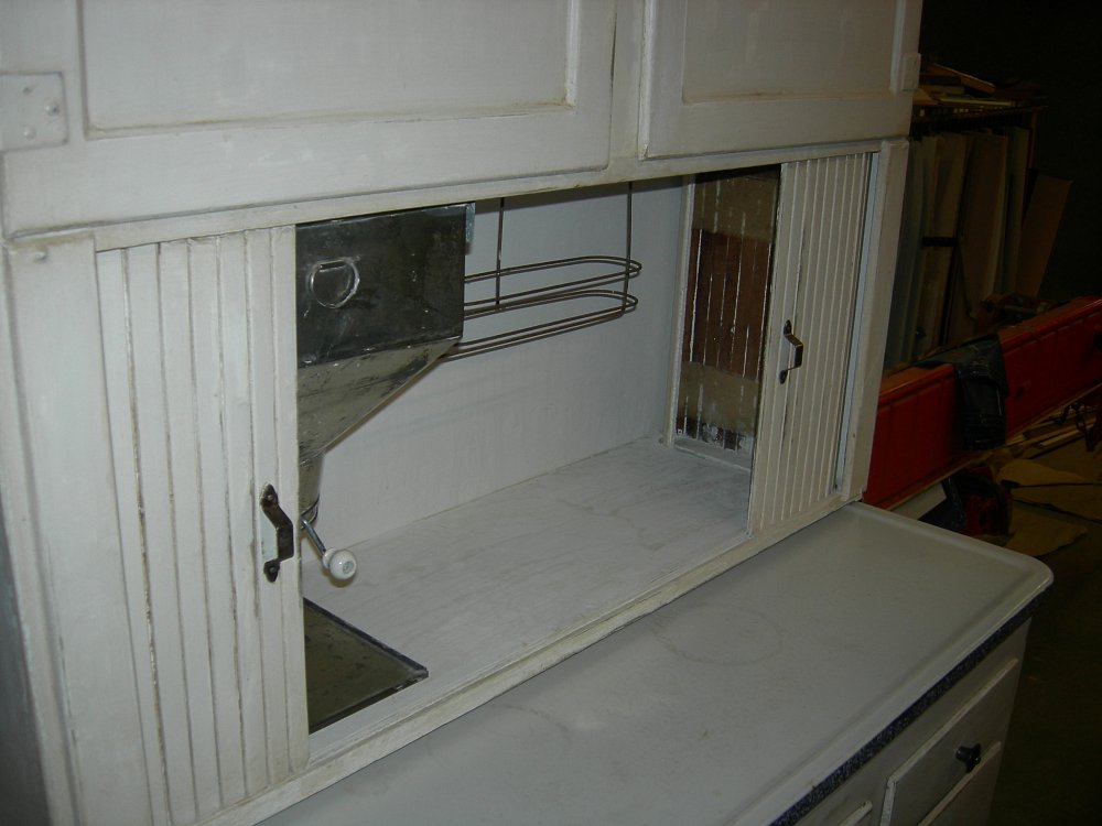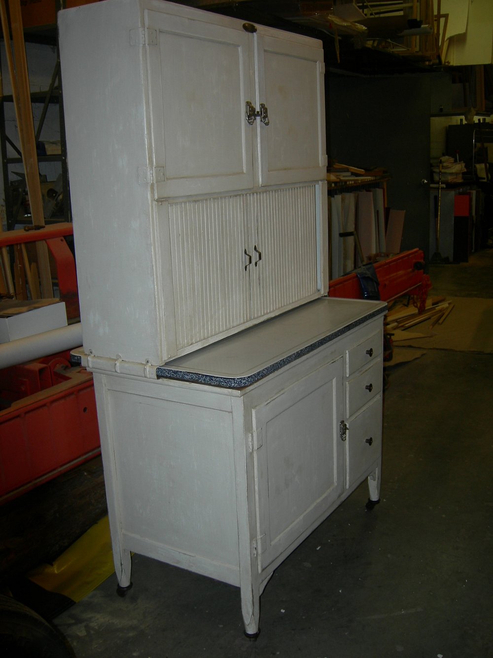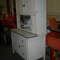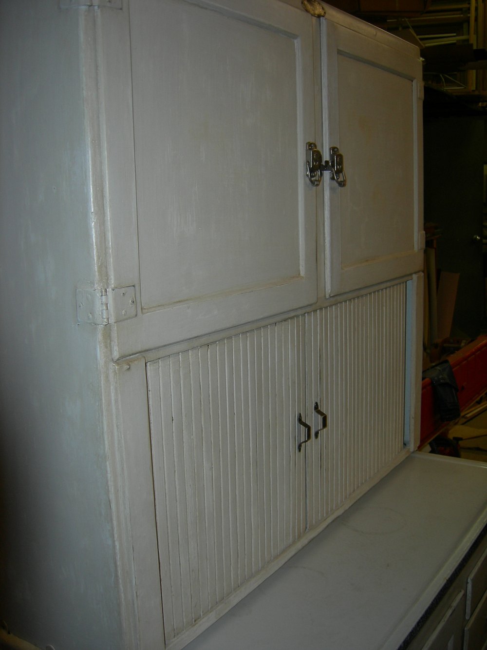 Hoosier Cabinet - Restored for ClientFamily's hoosier cabinet was in barn and neglected for many years, brought to me to restore. The doors and drawers were swelled shut and the original flour sifter was in bad shape. Removed all loose paint, built up finish until smooth. Applied beautiful aged finish to retain character. After restored, the client was delighted with the results and plans to use it and pass down to grandchildren.