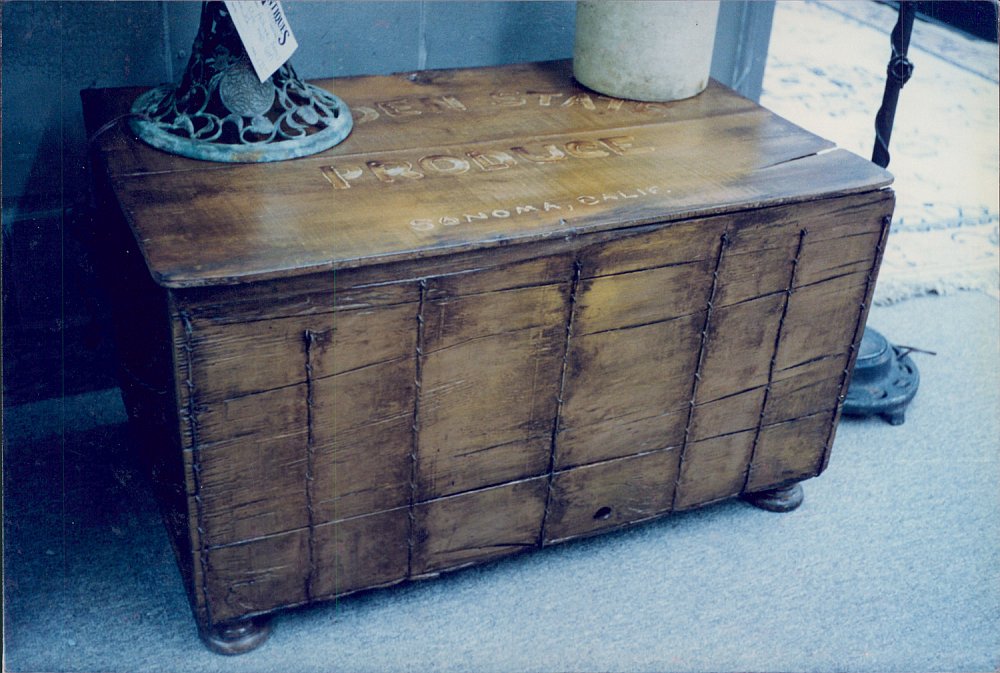 Crate TableTurn of the century, Produce Box, hand painted great patina. Started life as a produce crate. Repaired damage. Layered transparent stains on top of gold base. Hand lettered "Golden State Produce".
