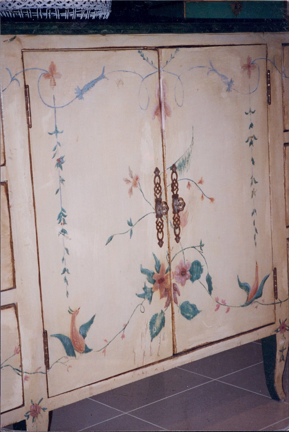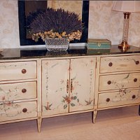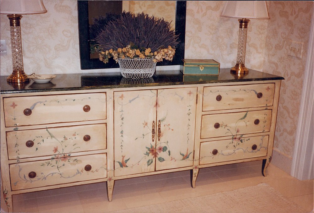 DresserNew Construction, Hand-painted, decorative detail on front and sides. Applied background color then removed to achieve aged finish. Faux marble top (deep umber), aged finish. Primed new wood surface.