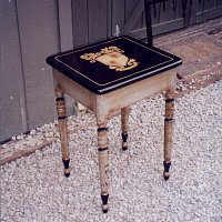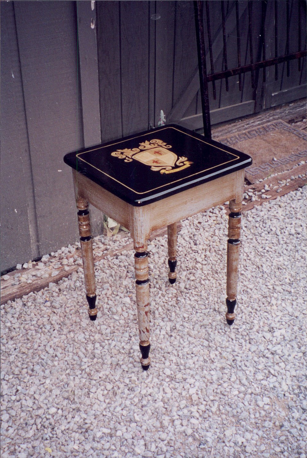 Hand-painted side tableHand painted petite side table, primitive beautiful aged finish. Aged layered finish on base. Family crest hand painted detail over black base.