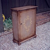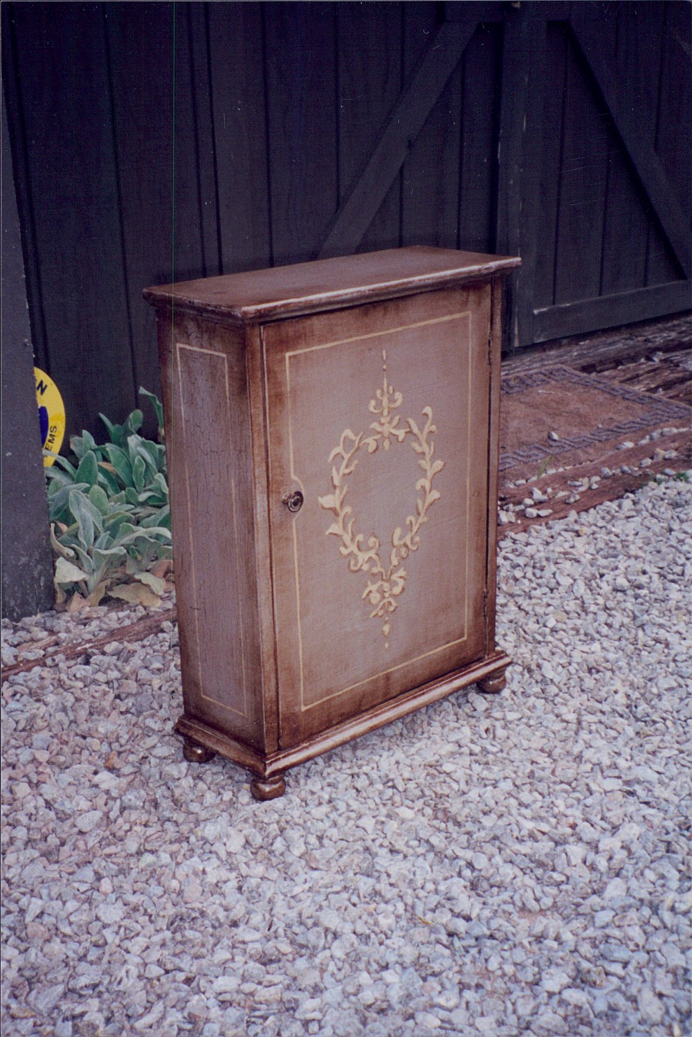 Hand-painted Wall CabinetComplete restoration. Petite Liquor Cabinet. Hand painted finish and detail. Small feet pads were added to stabilize. Hand painted decorative garland pasted on front. Heavy aged finish.